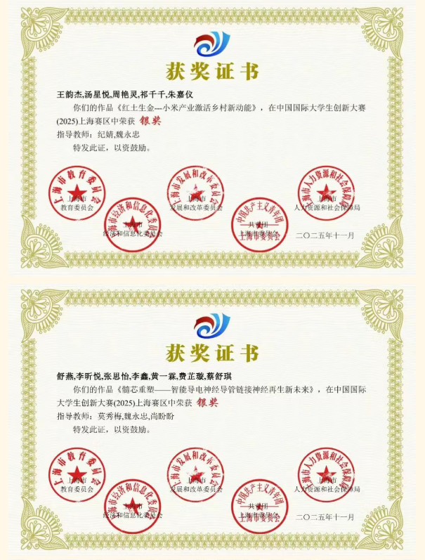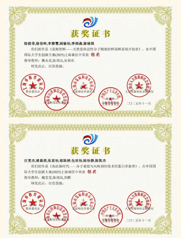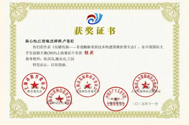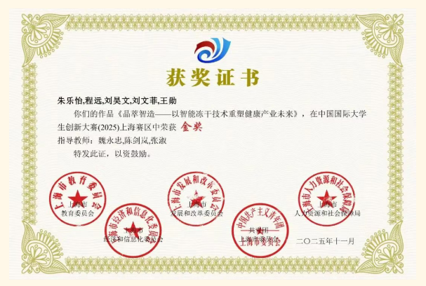 中国国际大学生创新大赛(2025)上海赛区赛事喜报传来!我院学子硕果盈枝,佳绩斐然。备赛期间,学院精心统筹、全力保障,各参赛团队深耕专业、满怀热忱,以扎实功底与过硬项目实力全力攻坚,最终斩获1金5银1铜的优异成绩,既为学院增添荣誉,更彰显食药学子锐意进取的精神风采,为学院高素质专业人才培养及社会发展夯实根基。