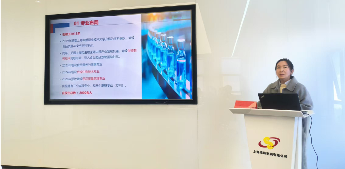 活动期间,食品药品学院副院长纪婧作学院及学生情况推介报告,围绕学校办学特色、食品药品学院学科与专业建设情况以及学生培养成效等内容进行系统介绍,重点展示了学院在人才培养、专业建设和服务产业发展等方面的优势与成果。相关内容受到与会政府部门和企业代表的关注。