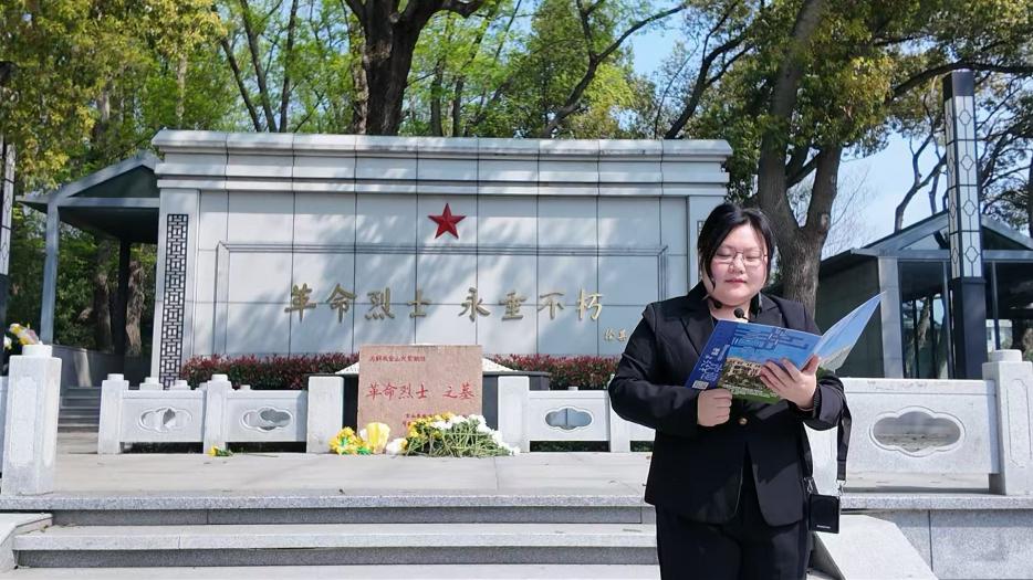 随后,食品药品学院直属党支部副书记陈剑岚向大家讲述朱泾镇无名烈士的英雄事迹。并讲述金山儿女的革命先驱黄珊臣同志与李一谔同志的故事。他们用青春和生命,换来了我们今天的和平与安宁。他们留下的,不只是烈士名录上的一个名字,更是一种信仰、一种精神、一种为了国家和人民甘愿付出一切的担当。今天的新时代青年,更要传承“把人民放在心上、把责任扛在肩上”的初心使命。