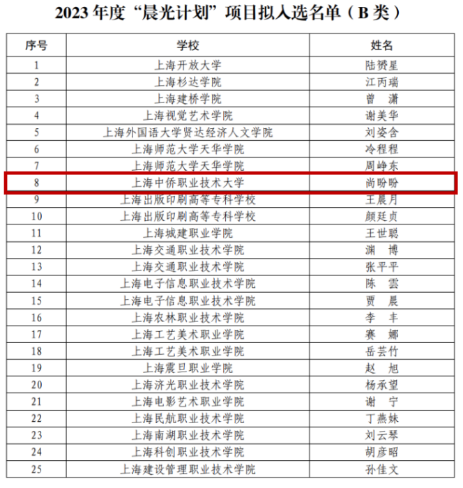 The Morning Light Plan is to strengthen the construction of the city's college teacher team and enhance the scientific research capabilities of young college teachers. It was initiated and funded by the Shanghai Education Development Foundation in 2007 and jointly implemented with the Shanghai Municipal Education Commission. It is aimed at young college teachers in the city. talent development plan. The Morning Light Plan funding targets are outstanding young teachers under the age of 30, with master's degrees or above, deputy senior titles and below, and strong scientific research capabilities. For a long time, the college has attached great importance to the training of young backbone teachers. Organizing and applying for the Morning Light Plan project has played an important role in stimulating and enhancing the scientific research enthusiasm of young teachers in our college and further improving the scientific and technological innovation level of our college.