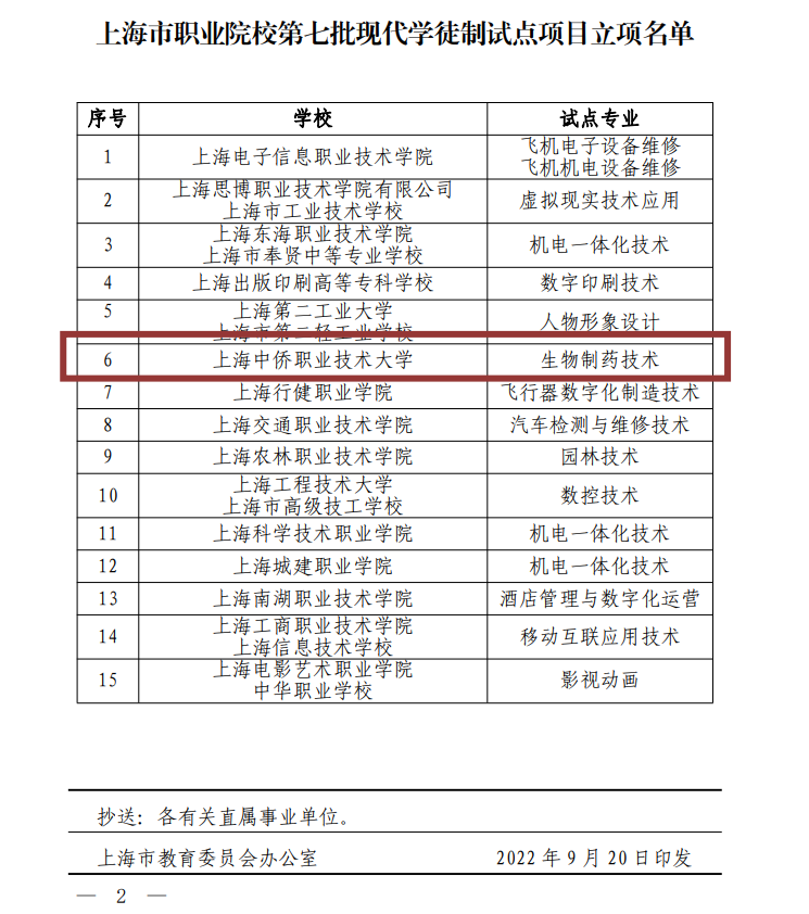 Biomedical technology is one of the three leading industries in Shanghai. In 2019, in response to the talent demand of the Shanghai Bay Area Biomedical Port, the School of Food at Zhongqiao Vocational and Technical University was approved by the Ministry of Education to establish a vocational college in biopharmaceutical technology and renamed the School of Food and Pharmacy.This major officially enrolled in 2020, with a steady increase in enrollment every year. Currently, there are over 200 students enrolled. Third year students have entered internship positions. In 2022, it was approved as the seventh batch of modern apprenticeship pilot majors in Shanghai. A large amount of work has been carried out in the development of training models, training plans, curriculum systems, engineering and academic alternation management models, and the construction and improvement of flexible credit systems.