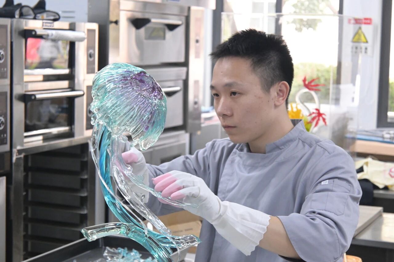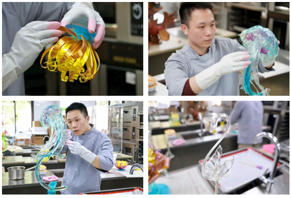 Teacher Liu Fuhuan uses jellyfish as the theme, showcasing the fluidity of sugar through precise temperature control, drawing, and blowing techniques, shaping semi transparent umbrellas and flowing tentacles, presenting a dynamic beauty. During the on-site teaching, students learned about the glass transition of syrup and understood the technique of shaping through temperature in sugar art. At the same time, Teacher Liu encourages students to actively participate in the skills competition, explore their professional interests and find their career direction in the preparation competition.