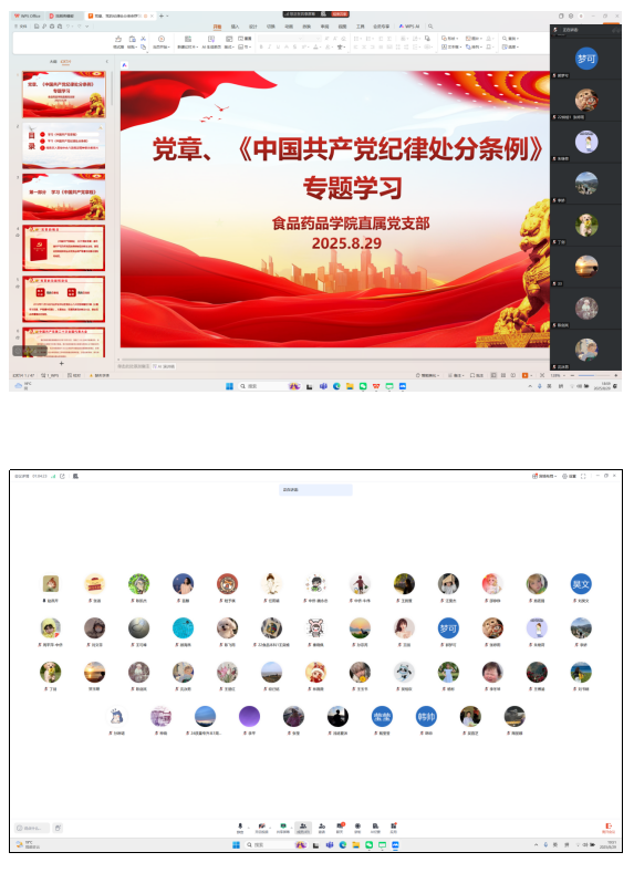 In order to deepen the study and education of party discipline and strengthen the ideological defense line of party members, on August 29, 2025, the Party branch directly under the School of Food and Pharmacy held a special learning activity on Tencent Meeting to promote the integration of party constitution and discipline into the mind and heart, and to strengthen the construction of work style. The party class was given by Chen Jianlan, the deputy secretary of the Party branch.