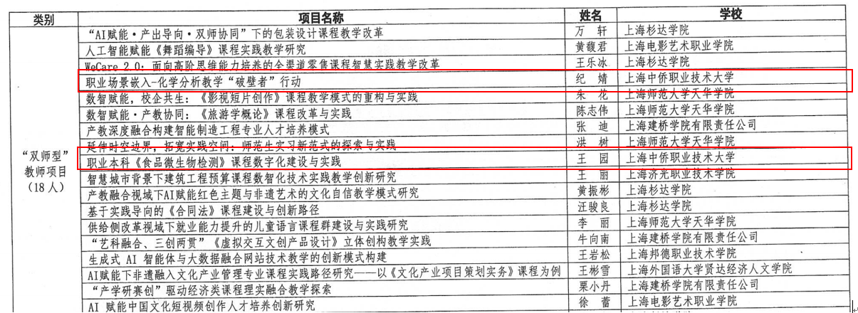 Recently, the list of selected teachers for the Famous Teacher Plan project in Shanghai's private universities in 2025 was officially announced. Two teachers, Ji Jing and Wang Yuan from the School of Food and Pharmacy, were successfully selected for the Dual Teacher teacher project with solid teaching skills, innovative teaching practices, and outstanding educational achievements. The Famous Teacher Program for private universities in Shanghai is initiated and guided by the Shanghai Municipal Education Commission, aiming to cultivate a high-quality, specialized, and innovative team of private university teachers, and to give full play to the leading role of outstanding teachers. The research projects submitted by the two teachers this time are based on the first batch of high-quality courses at the college level, demonstrating the college's dual breakthroughs in vocational education curriculum construction and the cultivation of dual qualified teachers.